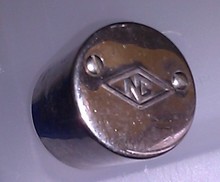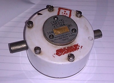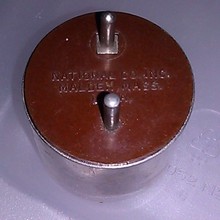 National Co., Malden, MASS made this chrome plated calibrator crystal. It has two pins on 3/4" centers X 0.125" thick.