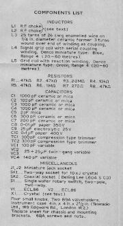 To use the station for other bands the appropriate coils in the Denco range should he used in place of those shown. The p.a. coil in the transmitter would require the number of turns to be varied accordingly, Suggested lines for experiment would be 45 turns for 3.5 Mc/s and 95 turns for l.8 Mc/s (fine wire). It is not suggested that the station be used on the higher bands due to the efficiency of the receiver decreasing with increased frequency.(Note: I believe the Denco coils may still be available from England - AF4K)