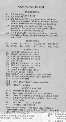 Now to consider the circuit in some detail. C1 is used mainly to isolate the crystal X1 from the h.t. (B+) line. Some constructors may point out that circuits do exist which do not use a capacitor at all in this position, but this would have meant that the crystal socket pins on the front panel were live ("hot") with respect to the case, and C1 was included to avoid this. R1 provides the necessary bias for the triode portion of V1 and L1 is an r.f. choke anode load.