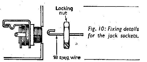 The crystal holder and the two jack plugs present a problem as once the chassis. is in place these three components are inside and have to be fixed from the outside. The jack sockets are "rescued" with a small piece of 18 s.w.g. wire bent as shown in Fig. 10. This was inserted into the hole in the "front panel", hooked on to the jack socket, and pulled. This exposed the threaded collar of the jack socket and the locking nut was then screwed on with tile other hand.