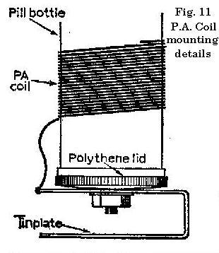 The p.a. coil will present no problems, being merely a length of wire wound on a 3/4 in. diameter coil former. The actual former used in the prototype was a pill bottle with a plastic top bolted to a piece of tinplate which was soldered directly to the chassis. However, 3/4 in. diameter formers (preferably ceramic) are available, which will save would-be constructors touring chemists shops (drugstores) with a ruler! The method of feeding the aerial from this coil is a matter of choice and will rather depend upon the aerial to be used.