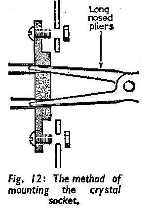 The crystal holder was a bigger problem, as there was no fixed threaded part which was itself connected to the component as in the case of the threaded collar on the jack sockets. In order to overcome this difficulty two bolts were inserted in the fixing holes in the crystal socket and were glued in place. When the glue was quite dry (24 hours to be certain) the socket was then wired into circuit and the chassis placed in the case. The jack sockets were then brought out as per the instructions given above. A pair of long-nosed pliers were then inserted into the actual crystal sockets and the whole assembly was pulled GENTLY into position. The two nuts were then screwed on with the free hand. (Fig. 12.)