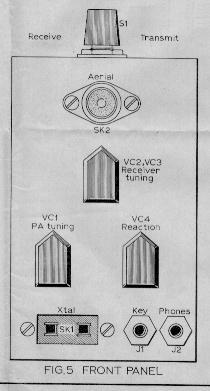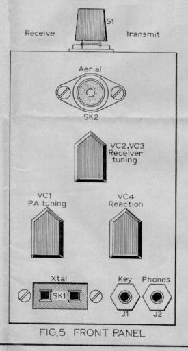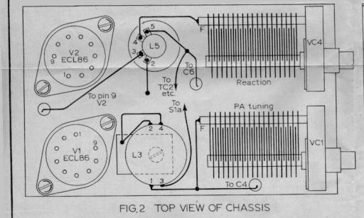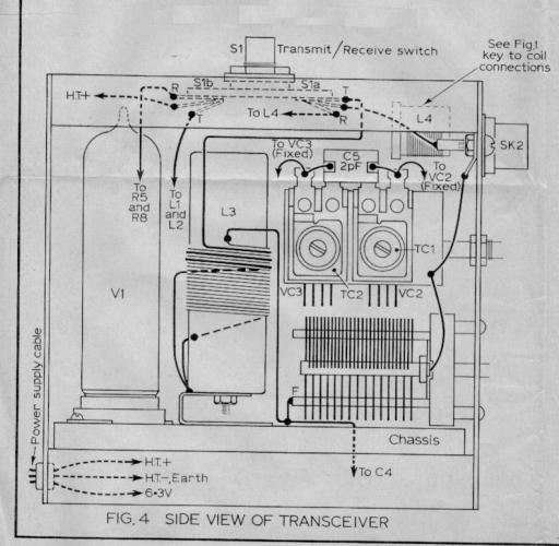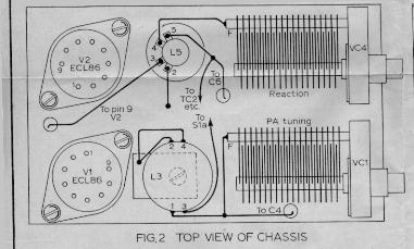 The aerial input and tuned circuits may appear a little unusual, especially on the receiving side. One of the shortcomings of a regenerative detector is poor selectivity. The present circuit helps to improve matters by providing an additional tuned circuit ahead of the usual one VC3, L5. These two tuned circuits are top coupled by the small capacitance of C5 and it is very important that this is the only coupling between the two.