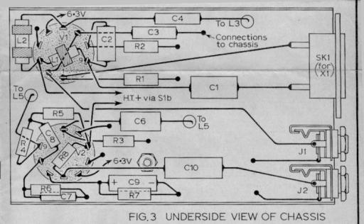 In the prototype, there is no form of ventilation and in view of the bulb temperature attained by miniature glass valves it is advised that a number of small holes, grouped in a neat pattern, be drilled in strategic places in the case: at the rear of the valves, low down near their bases, and immediately above them should suffice.
