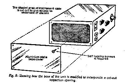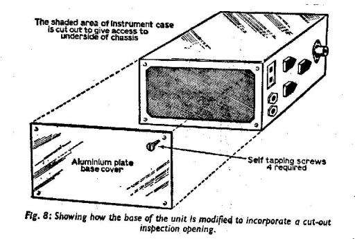 One interesting and very practical suggestion is that the bottom on the case should be removed and a small base-plate fitted. This would make inspection and servicing very much simpler - not to mention ease of construction. See Fig. 8. This is not done in the prototype and there may be some, who, for various reasons will not wish to cut a panel from the case. For the benefit of those the following tips are offered based on experience gained in wiring the original unit seen in the photograph.