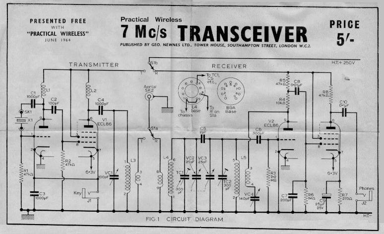 The transmitter consists of a Pierce crystal oscillator operating on 7 Mc/s followed by a pentode power amplifier also tuned to 7 Mc/s. This circuit configuration (See Fig 1 on Blueprint) is chosen so as to use the minimum number of components consistent with reliable performance. NOTE that the ECL86 is the same as a 6GW8 tube in the USA.