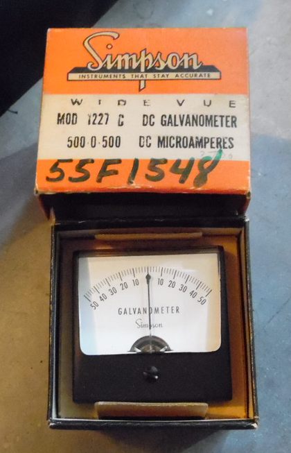 Brand new in the box. Beautiful square Simpson panel meter for +/- 500 uA DC.