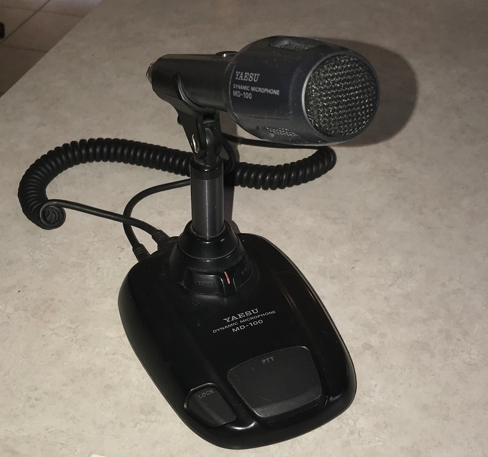 The Yaesu MD-100A8X desk mic features a cardioid dynamic mic element. It features UP-DOWN tuning (on compatible Yaesu transceivers). There is a scan switch, a switch for PTT (push to talk) and also a lock feature. The frequency response is 100 to 5000 Hz. Sensitivity is -75dB (0 dB=1 V/0.1 Pascal). Impedance is 500 ohms unbalanced. Weight is 24 ounces (670 grams).