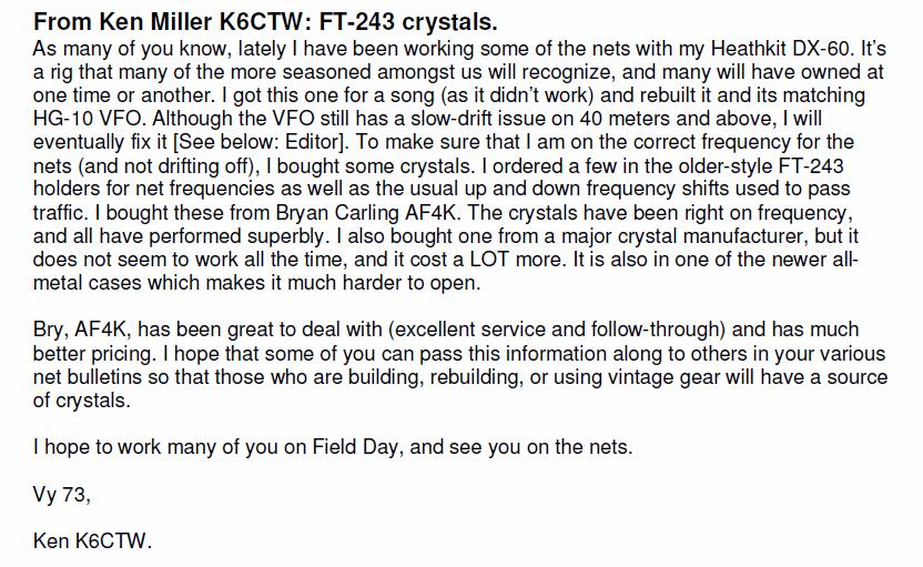 Brian Got my xtals in the mail today. Great packing job. They are A number one right on the money. Definitely a good investment for my Knight T- 60. I'm having a ball on AM and low power cw on 80 and 40 meters. Now I'm all set for SKN on Saturday.